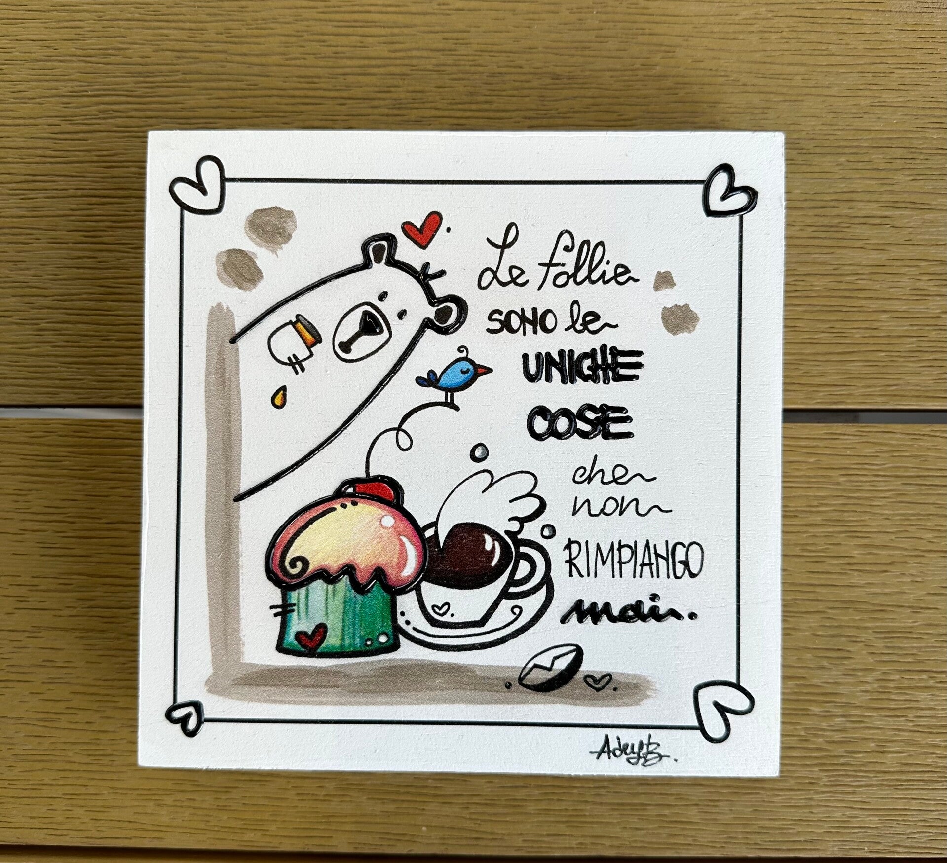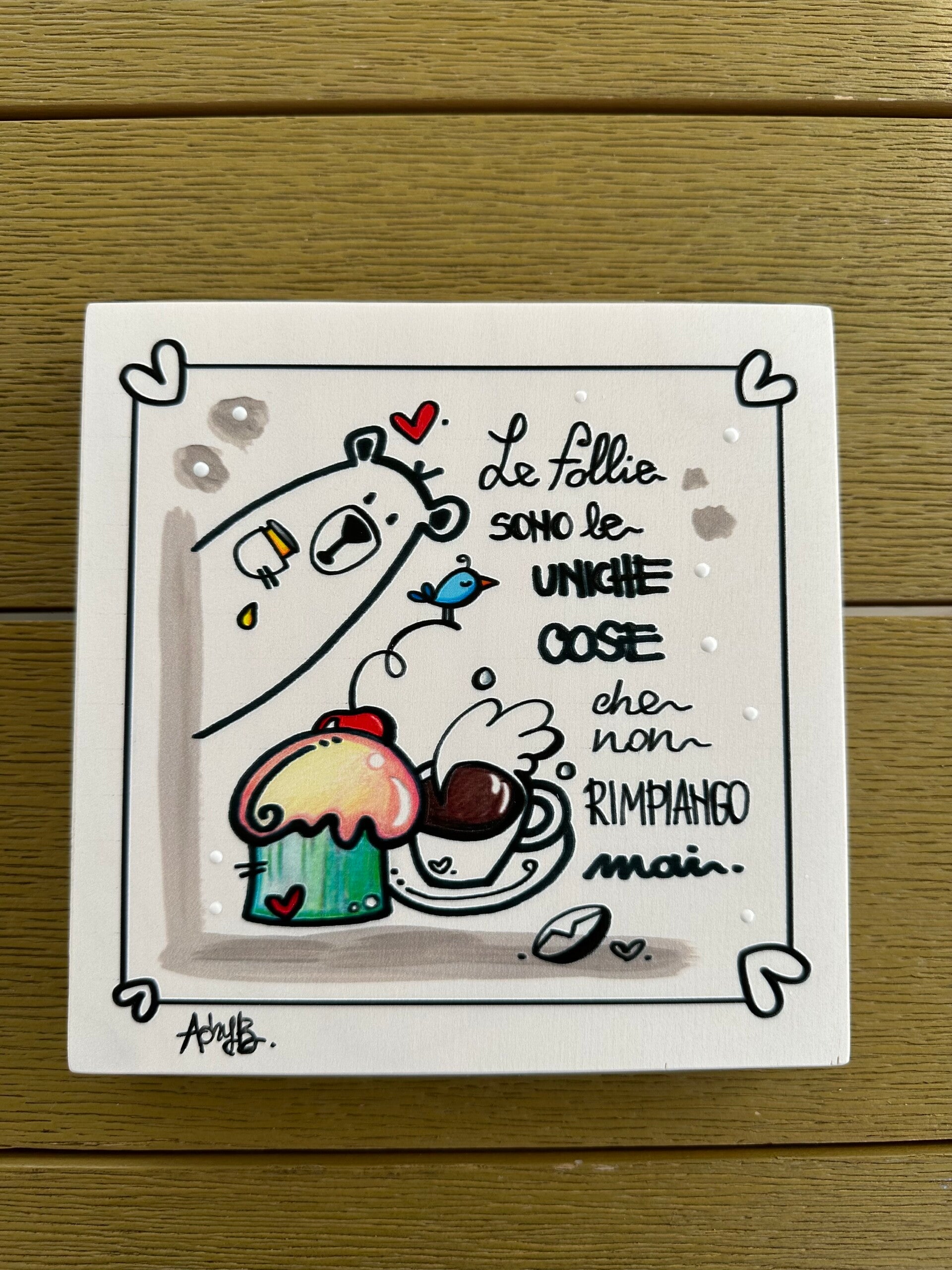 Quadro in legno serigrafato artigianalmente e ritoccato a mano. I quadretti sono materici in quanto tutti i profili e le scritte sono a rilievo.