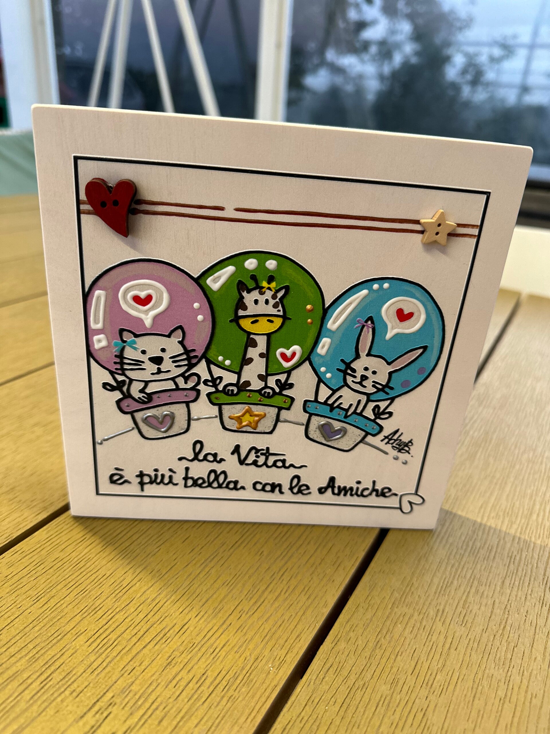 Quadro in legno serigrafato artigianalmente e ritoccato a mano. I quadretti sono materici in quanto tutti i profili e le scritte sono a rilievo.