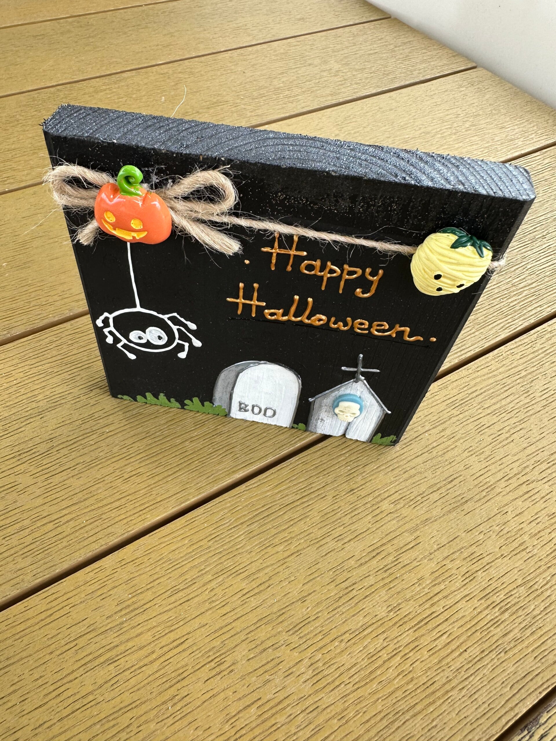 Quadretto d'appoggio come decorazione di Halloween, in legno, dipinto a mano con decorazioni applicate e scritte a rilievo.