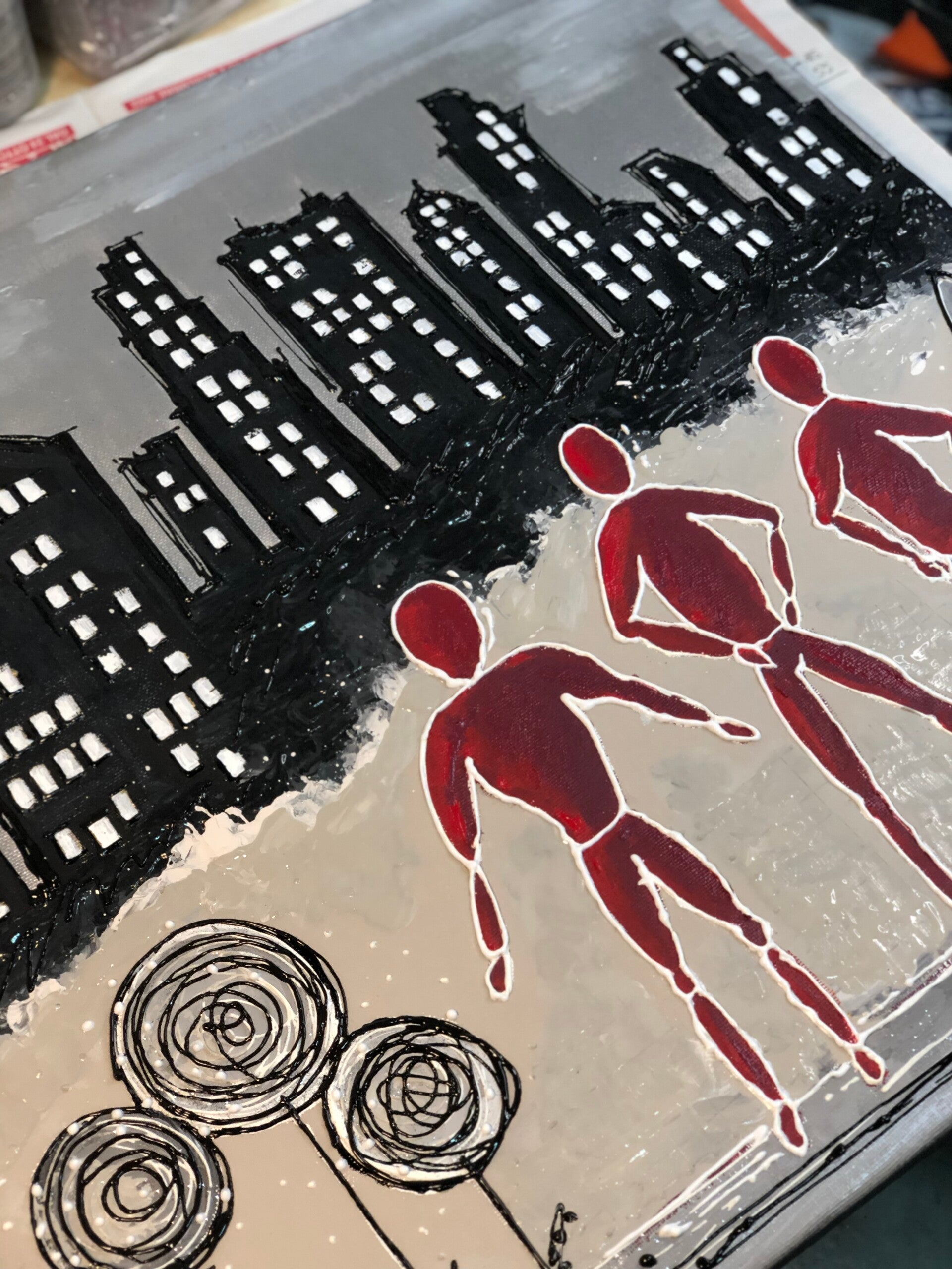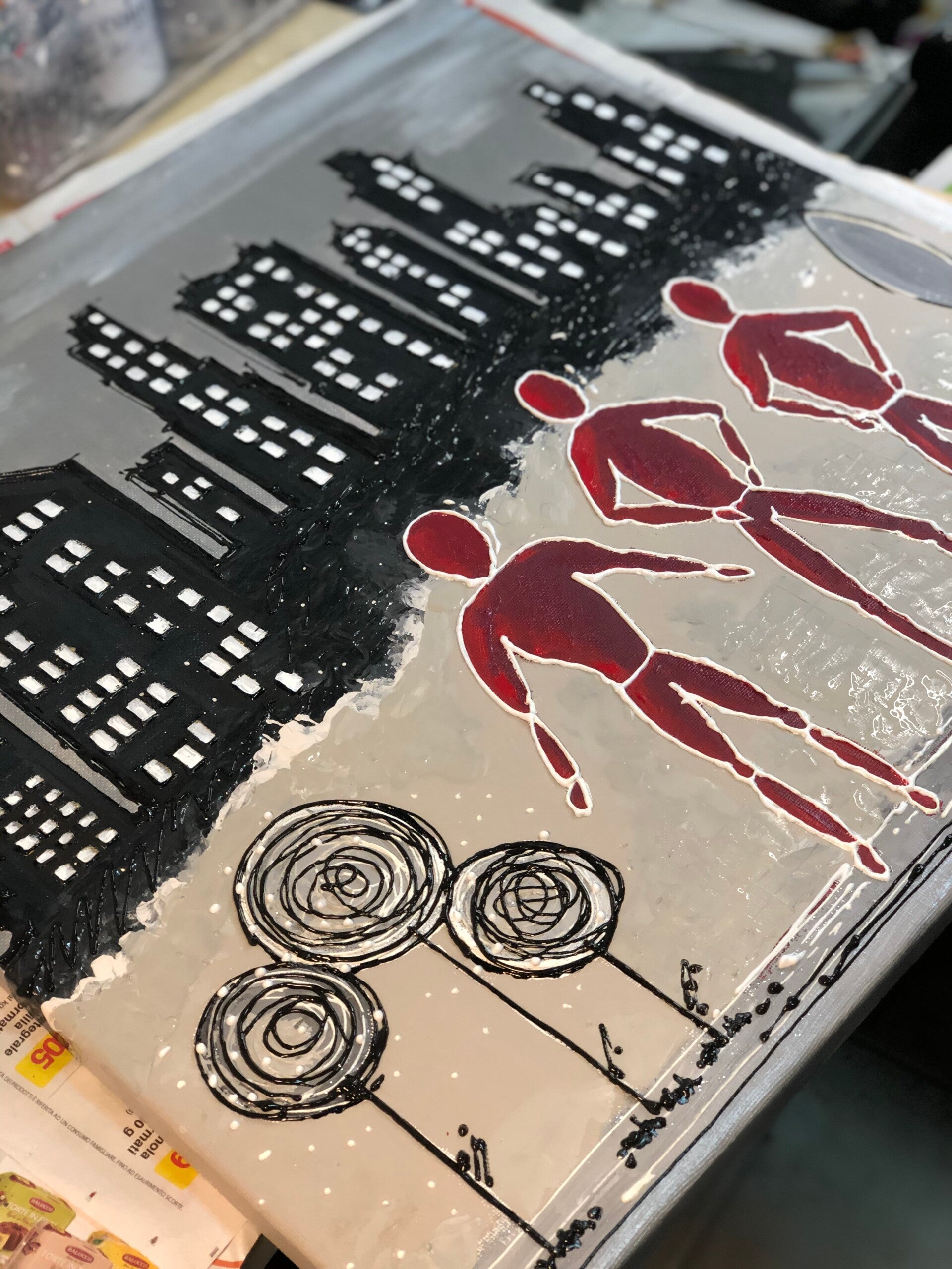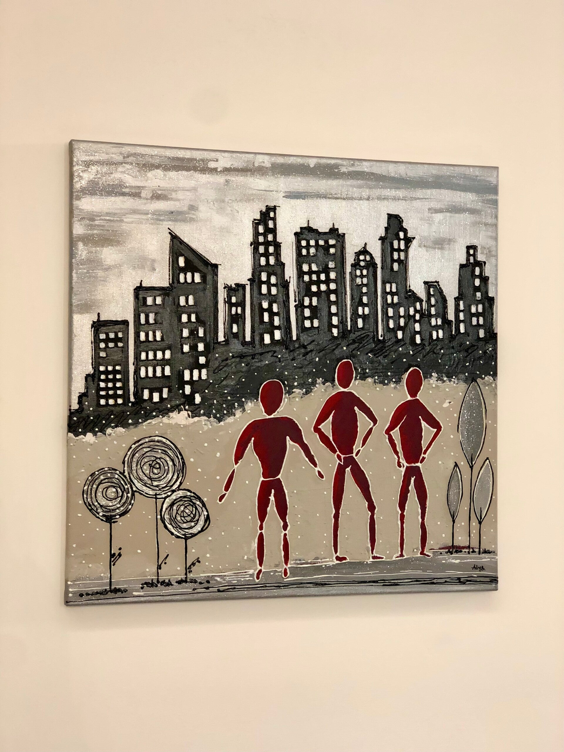 Quadro dipinto a mano su tela con colori acrilici, profili a rilievo ed alcuni dettagli sono glitterati, come lo sfondo del celo argento sfumato ed alcuni particolari nei fiori stilizzati in primo piano, dando un particolare effetto luminoso sotto la luce diretta.