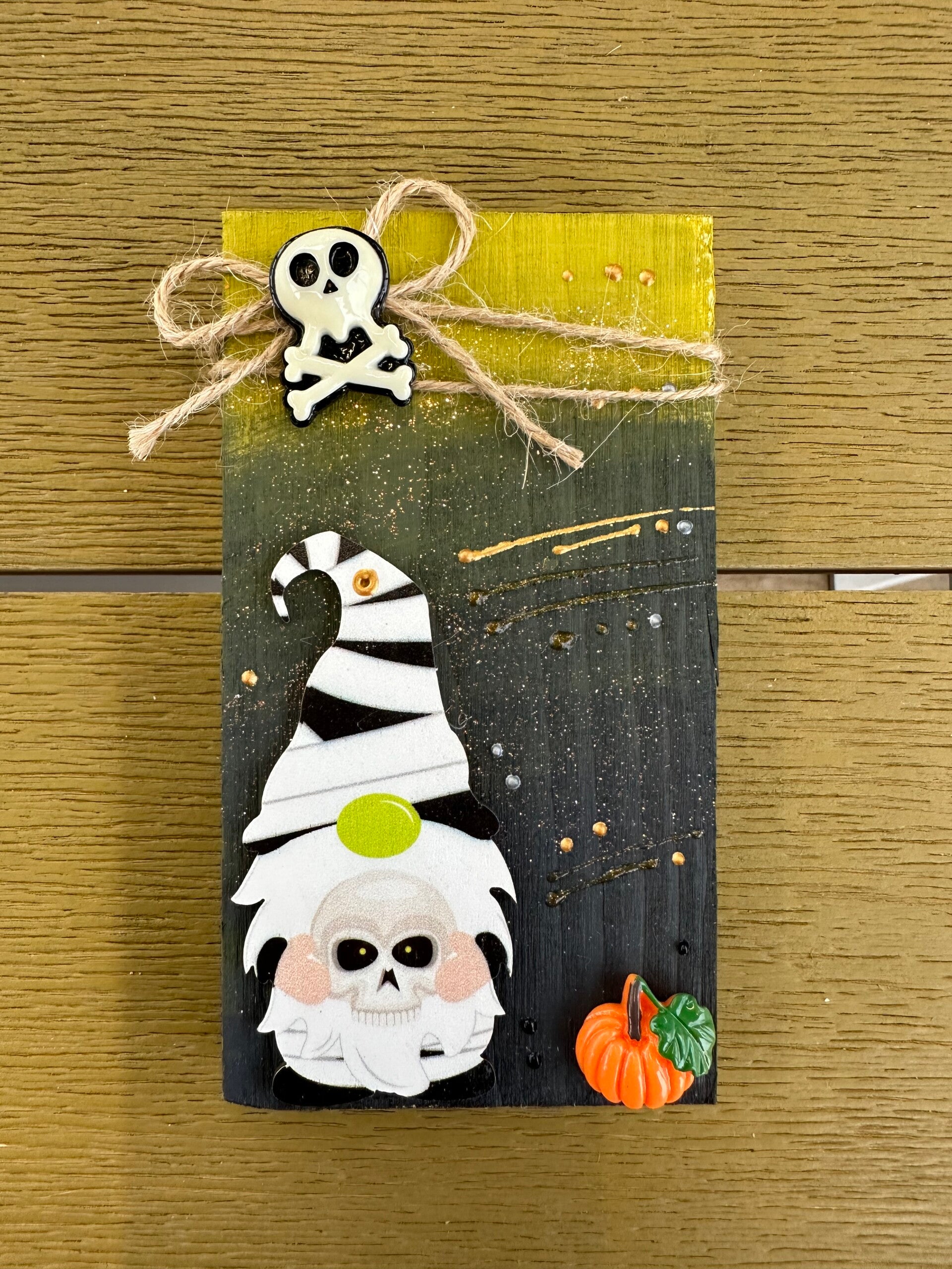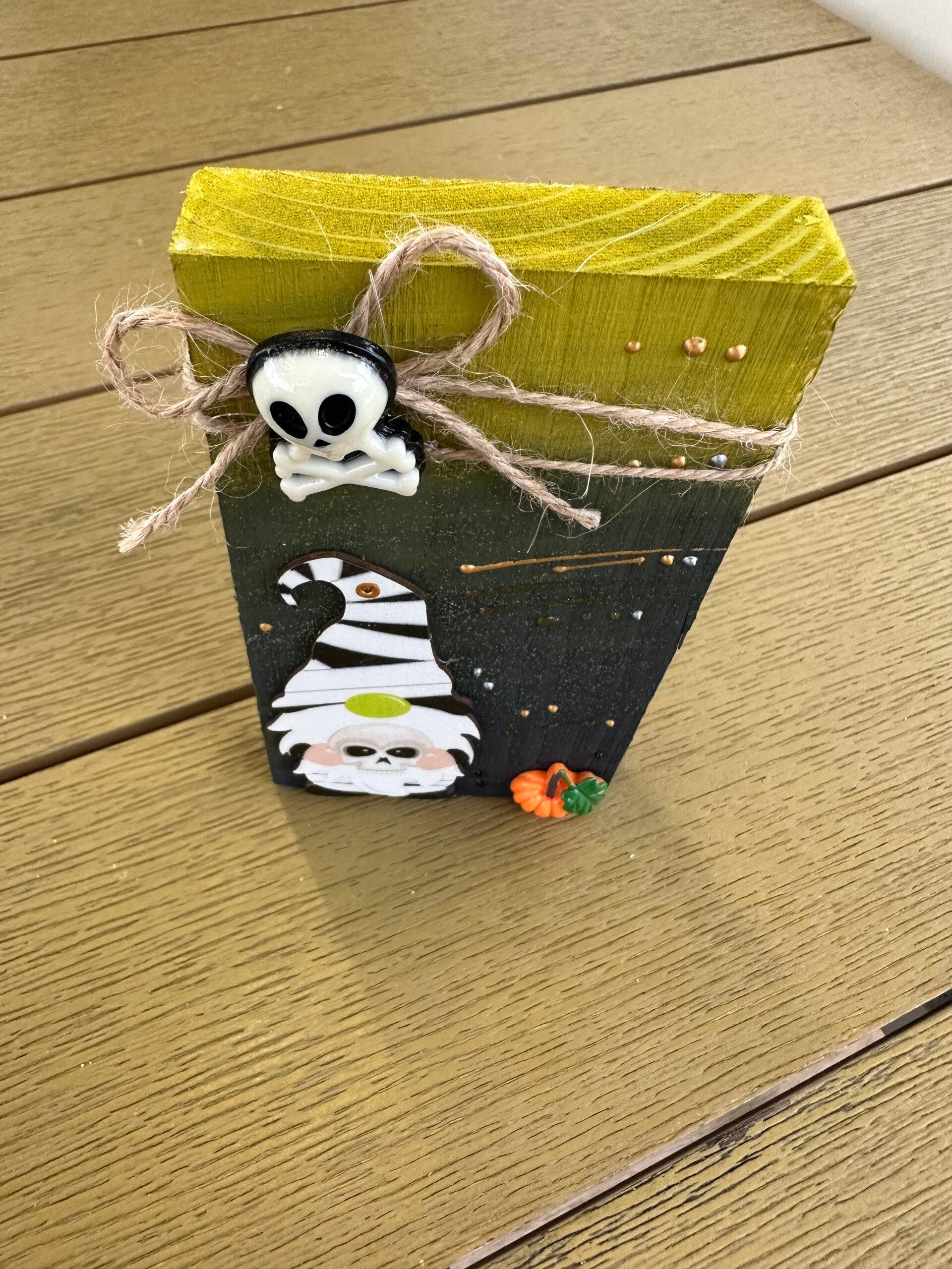 Quadretto d'appoggio come decorazione di Halloween, in legno, dipinto a mano con decorazioni applicate e scritte a rilievo.