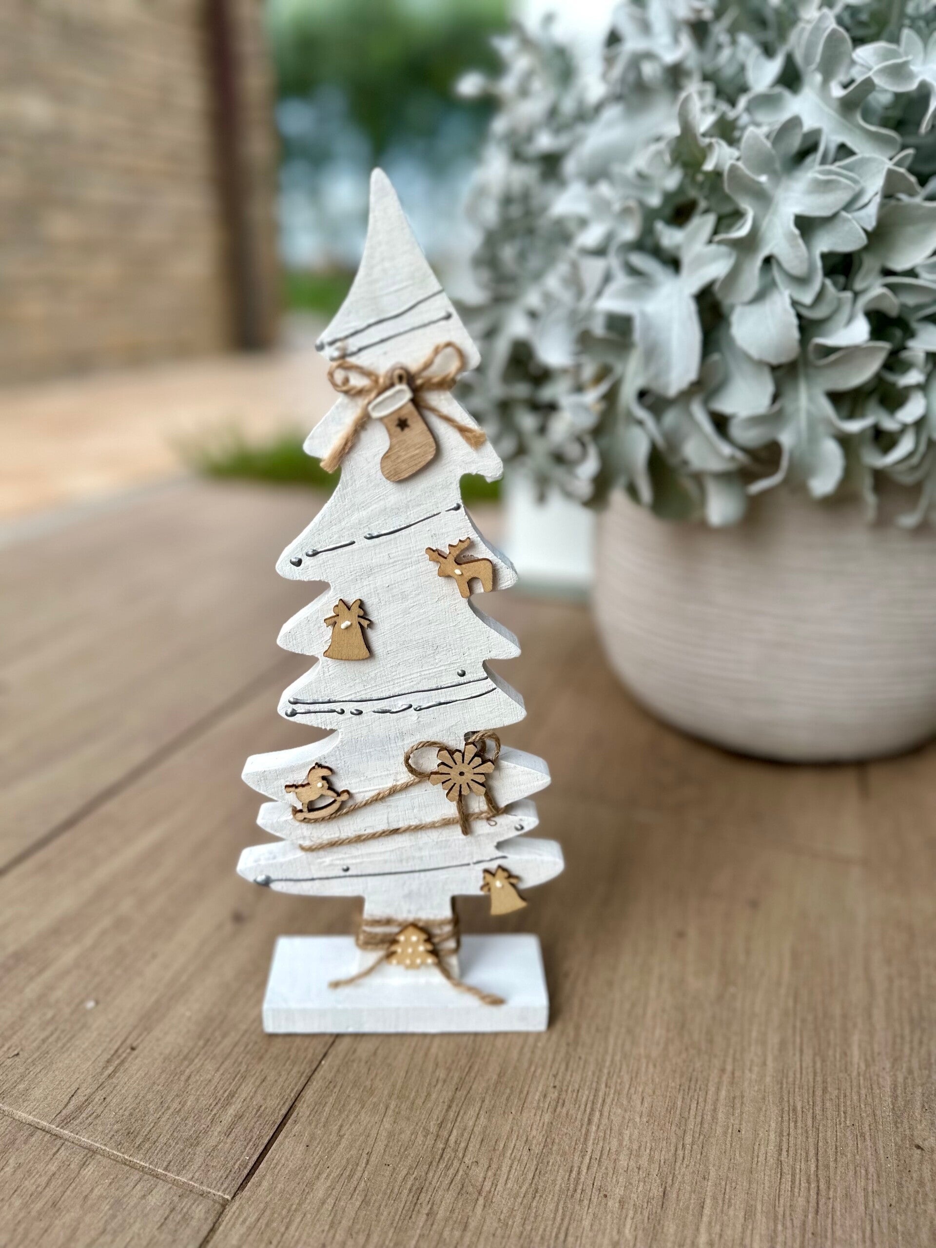 Alberello di Natale in legno dipinto a mano con applicazioni.