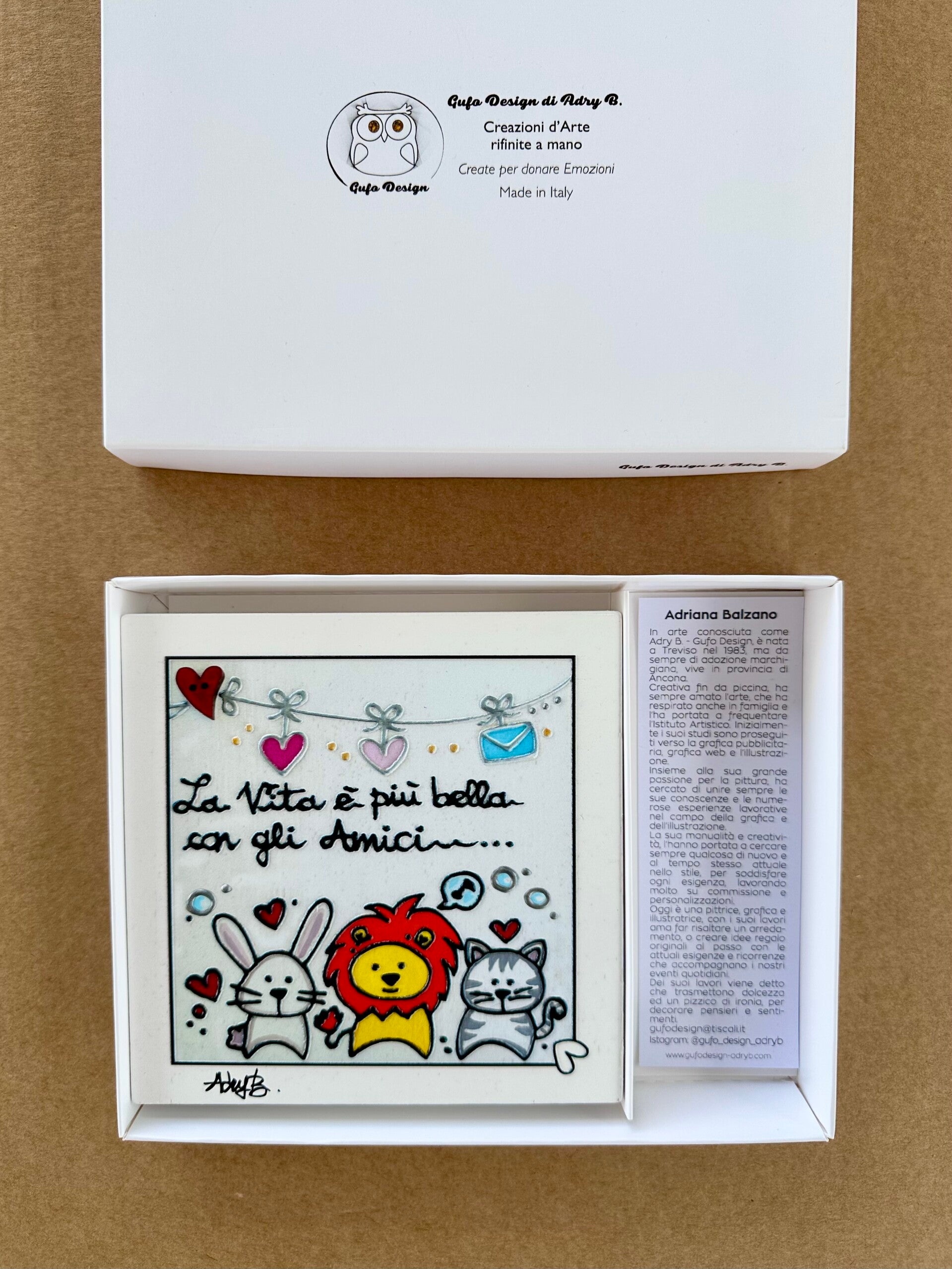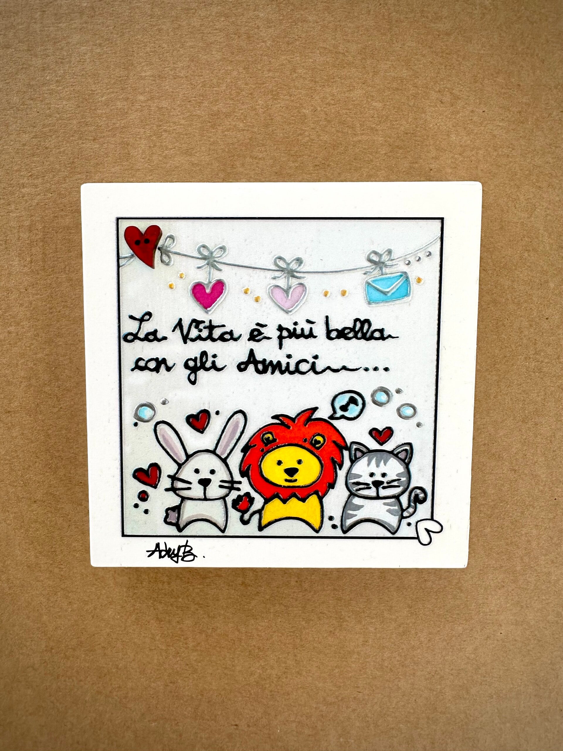 Quadro in legno serigrafato artigianalmente e ritoccato a mano. I quadretti sono materici in quanto tutti i profili e le scritte sono a rilievo.