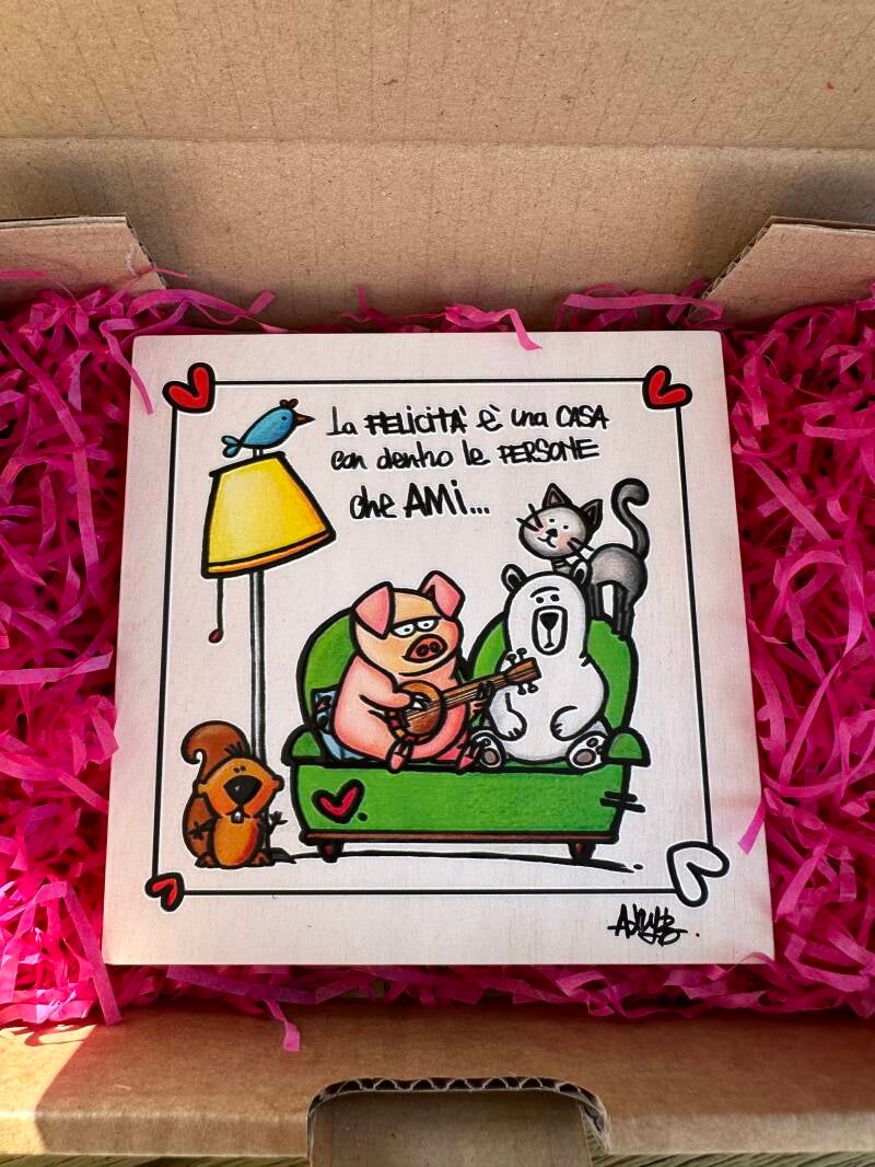 Quadro in legno serigrafato artigianalmente e ritoccato a mano. I quadretti sono materici in quanto tutti i profili e le scritte sono a rilievo.