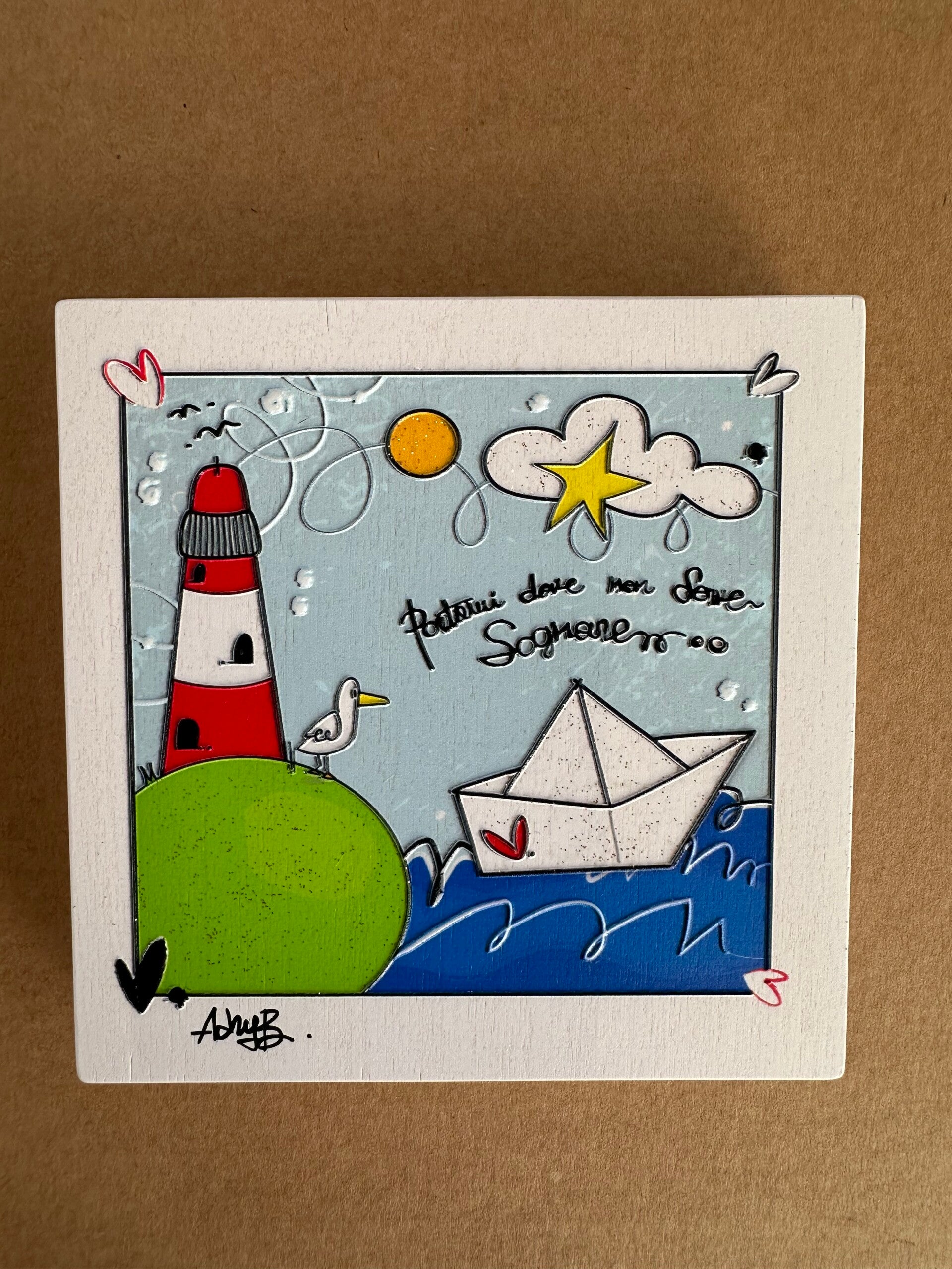 Quadro in legno serigrafato artigianalmente e ritoccato a mano. I quadretti sono materici in quanto tutti i profili e le scritte sono a rilievo.